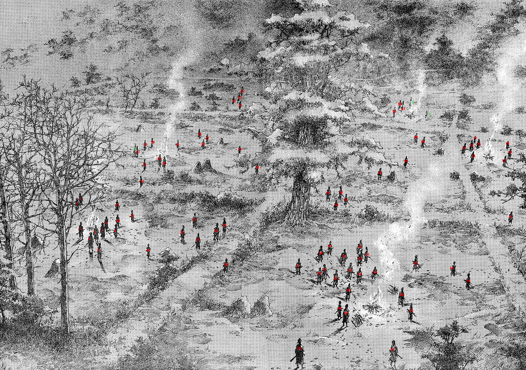 Now, the most, though certainly not the only, challenging and disputable part of this was the duel with the Yoshioka school at Ichijoji. If it were just a number count, I could add the proverbial 70 and be done with it, but, as you can see, I'm putting them in order, meaning I'd actually have to count the Yoshioka in the order they were slain to see where to add the nameless hash marks. Well, I did exactly that, trying my best to avoid possible doubles or repeats, and the results were more interesting than I expected. My final count above is way beyond 70, up to 80 actually. Well, I counted pretty closely, of course there's still a margin of error for debate, but then there's this; before the fight, the two page spread of all the Yoshioka awaiting Musashi: